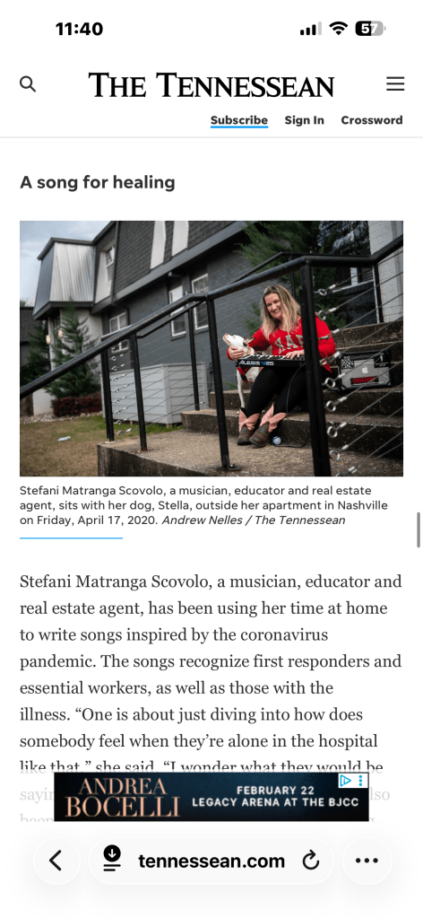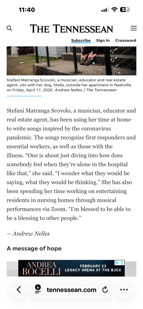 ALSO THE TENNESSEAN WROTE AN ARTICLE ABOUT STEFANI AND BRINGING HEALING THROUGH MUSIC (READ BELOW) : Hello World!